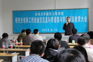 于9月13日在南湖校区召开了研究生培养工作经验交流及科学道德与学风建设教育大会。院党委书记程钺、院长赵晓晖、常务副院长康健、院党委副书记周求湛、副院长李月及全体研究生指导教师参加了本次大会,大会由副院长刘富主持。