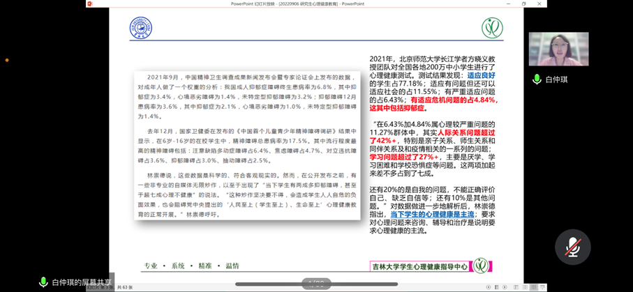 On 8 September, Bai Zhongqi, Deputy Director of the Student Mental Health Guidance Center of Jilin University, presented freshmen with a mental health education lecture at the College of Communication Engineering (CCE) invitation, aiming at popularizing knowledge about mental health, shaping freshmen’s correct concepts of mental health, and promote the harmonious development of their physical and mental health. The lecture was held online and attended by all postgraduate and undergraduate students enrolled in 2022, presided over by Liu Xingtong, Deputy Secretary of the CCE’s CPC Committee.